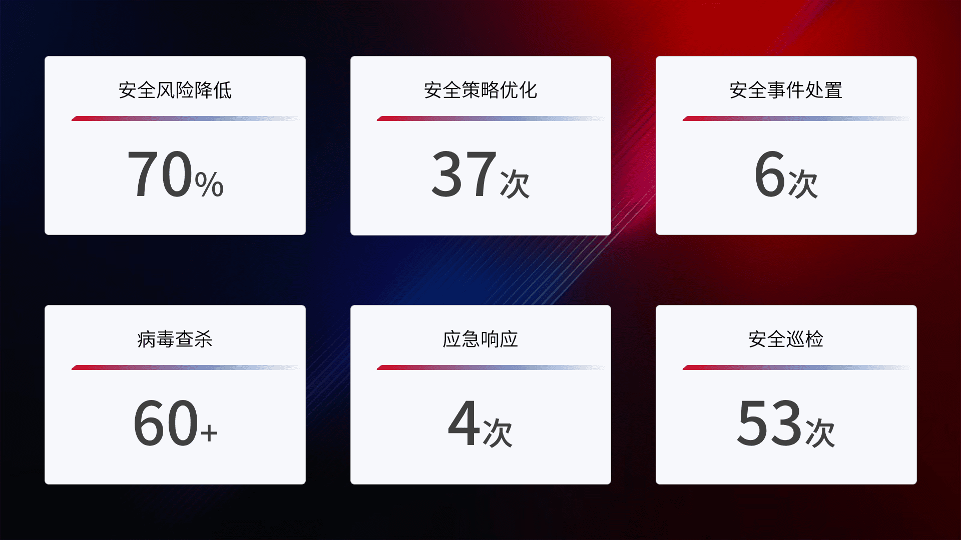 提供全面的安全事件报告体系,,,,包括处置报告、、、、周报、、、季度和年度总结,,结合持续监控,,帮助客户深入了解网络安全状况。。