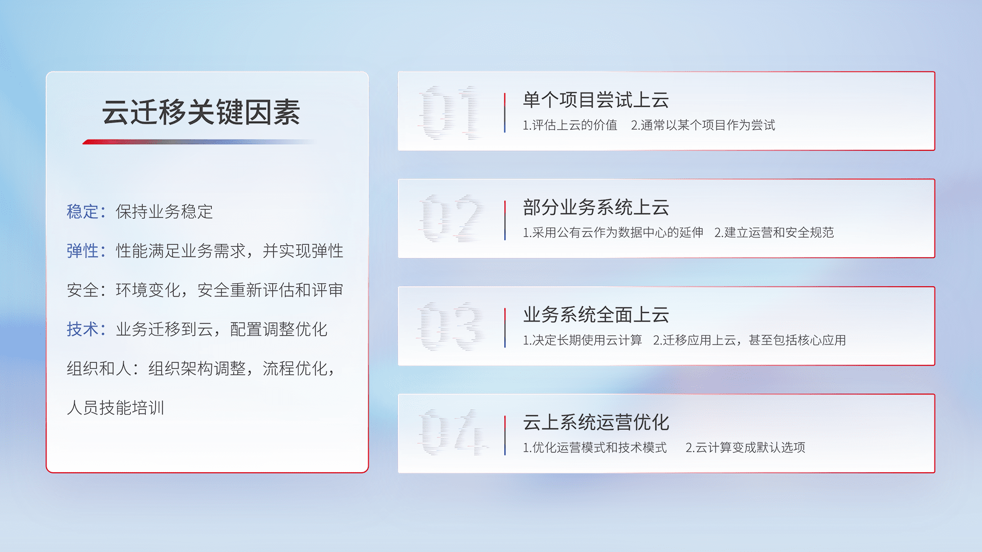 结合实际业务,,,,从规划设计、、云平台选型、、、、云原生改造、、、数据迁移、、、集成交付,,,迁移全过程为客户识别最佳上云路径,,做好风险识别管理,,设计网络架构、、身份权限、、安全审计合规、、、、操作审计、、日志审计、、、监控告警策略、、、、多站点容灾设计等,,,,对云上基础设施进行整体规划,,,,提升IT治理水平,,以满足弹性、、高可用、、、高性能的需求。。。。