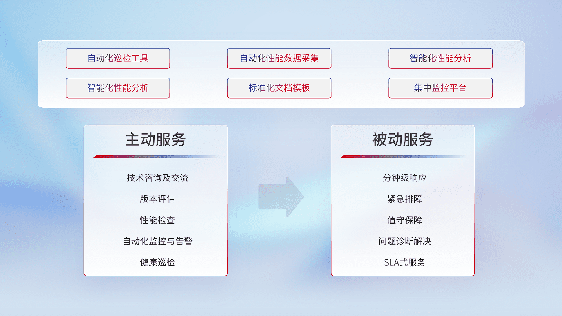 智能化工具和标准化文档,,,保障服务质量,,,提供主动服务(包含技术咨询、、、、版本评估、、、、性能检查、、、、自动化监控与告警、、、、健康巡检)和被动服务包含(分钟级响应、、、紧急排障、、、、值守保障、、、问题诊断解决、、SLA服务)。。。。