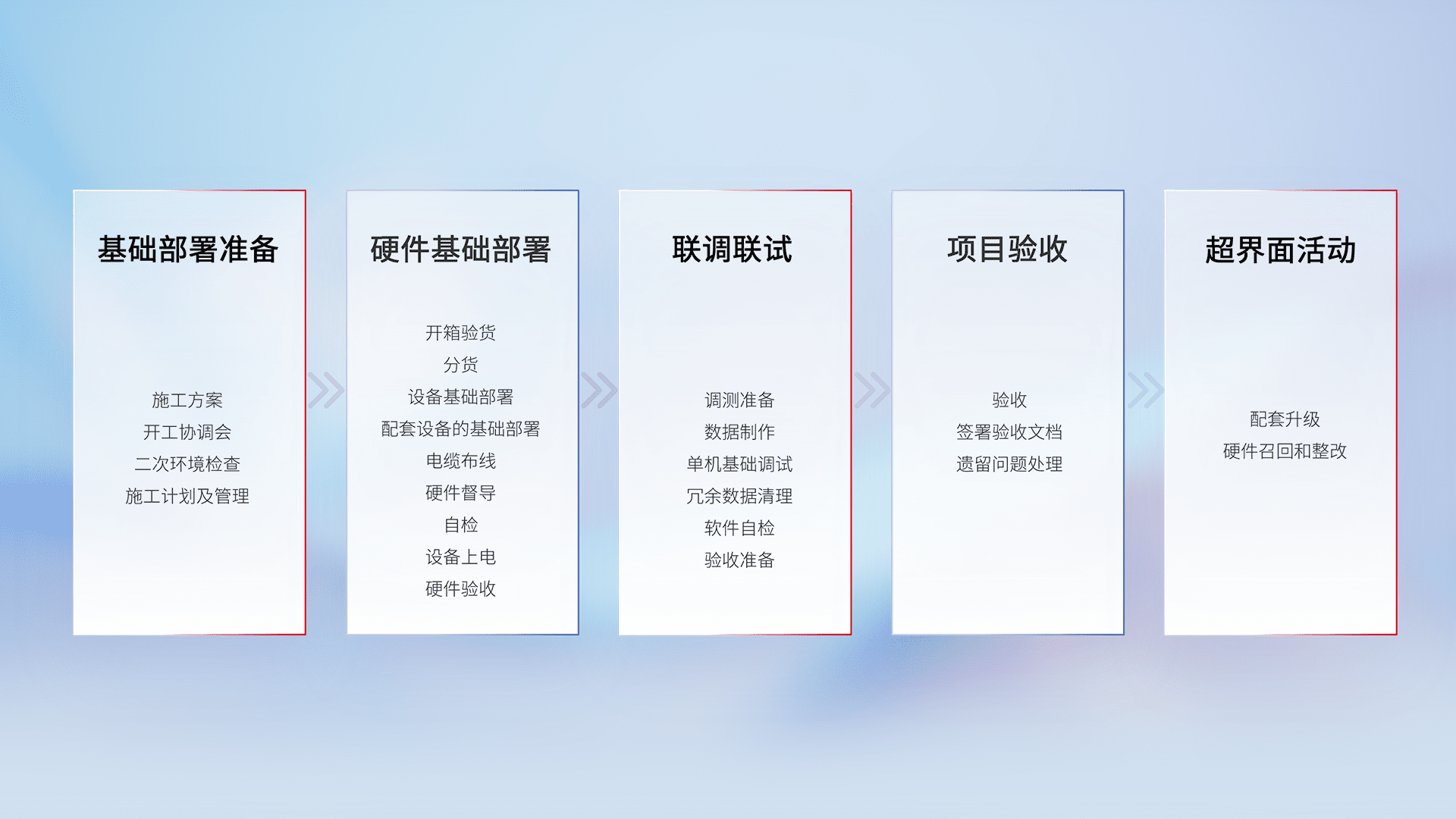 从基础部署准备、、、、硬件基础部署、、、、联调联试、、、项目验收、、越界面活动的全过程可追溯,,保证施工质量和进度。。